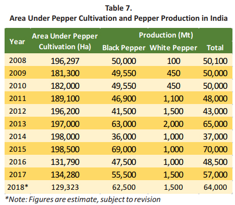 Besides exporting raw material (whole Pepper), India also exports significant quantity of Pepper products such as green and ground Pepper, oil and oleoresin of Pepper. Since 2008-2010 the area under pepper cultivation in India had shown a decreasing trend. A drop of 7% in term of area of pepper cultivation was reported when comparing 2008 and 2010. Starting 2010, the area of pepper cultivation in India had continuously increased to 2015. In 2015, India planted pepper on 198,500 Ha of area, recording a 9% increase (Table 7). In 2016, area under pepper cultivation in India dropped significantly by 34% to 131,790 Ha.