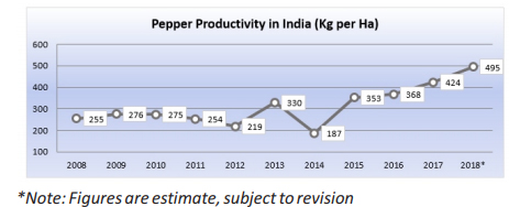 Pepper productivity in India in the past 11 years fluctuated with a slight positive trend. From 2008 until 2017 pepper productivity in India was reported to have increase by 66%. Whilst the highest pepper productivity in India was reported in 2017 with 424 Kg per Ha. In 2018, pepper productivity in India was estimated to increase by 17% as compared with the previous year totalling at 495 Kg per Ha.