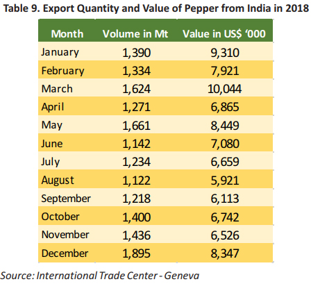 The number of pepper exports from India has reportedly fluctuated during 2018. In 2018, the average pepper export from India was 1,394 Mt per month with an average value of USD 7.5 million per month. In 2018, the highest exports from India occurred in December with quantities reaching 1,895 Mt (Table 9). The high level of exports during that period were due to India harvest season so that the stock of pepper was relatively high.