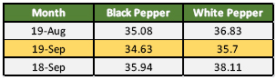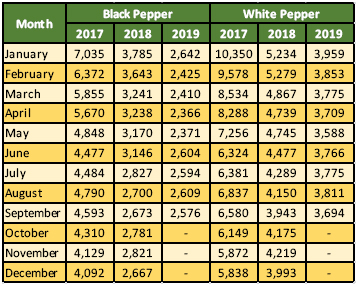 Composite price of black and white pepper for the 9th month of 2019 were reported with a deficit respectively. Losing USD 33 per Mt as opposed to the previous month, the composite price of black pepper was reported at USD 2,576 per Mt. September 2019 saw composite price of white pepper recorded a significant USD 117 per Mt deficit as opposed to July 2019 and was reported at USD 3,694 per Mt (Table 2). Recording the second biggest deficit of the year just behind USD 121 Per Mt loss on May 2019.