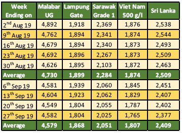 Pepper prices in 9th month of 2019, showed a negative outlook with Malaysia origin was reported with the biggest drop as opposed to the previous month. The farm gate of black pepper in India was reported at an average of USD 4,579 per Mt (Table 3). Thus, recording a 3% deficit when compared with August 2019. The decrease in price of black pepper in India could be contributed to large quantity of cheaper Sri Lanka pepper imports entering India at the MIP since August 2019. In a preliminary report released by Department of Commerce Govt. of India, India imported more than 800 Mt of whole pepper from Sri Lanka just in August 2019 alone.
