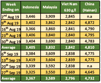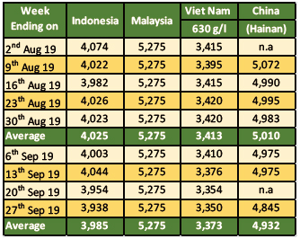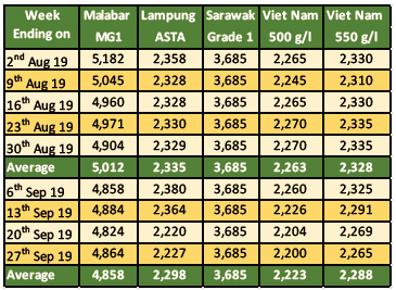 The price of black pepper in Indonesia (Lampung black pepper) had also weakened when compared to August 2019. The farm gate price of Lampung black pepper for September 2019 was reported to be at an average of USD 1,868 per Mt, recording a decrease of USD 32 per Mt or 2% as compared to the previous month. As farmers in Lampung expecting significantly more yield this year following the favorable weather condition, market was flooded with abundance of stock which pushed down price in local currency to an average of IDR 26,190 per Kg.