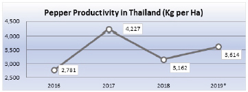 Pepper productivity in Thailand in the past 4 years was reported fluctuated. From 2016 until May 2019 pepper productivity in Thailand was reported with an increase by 30%. Furthermore, the highest pepper productivity in Thailand was reported in 2017 with 4,227 Kg per Ha. As of May 2019, pepper productivity in Thailand was reported with an increase by 14% as compared with the previous year at 3,614 Kg per Ha (Chart 1).