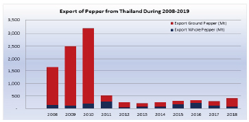 Year 2018 saw an increase in terms of pepper export by Thailand. Thailand was reported to have exported a total of 418 Mt which comprised of 71 Mt of whole pepper and 347 Mt of ground pepper. Thus, recording an increase of 50% or 140 Mt as compared with the previous year.