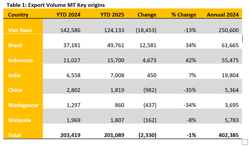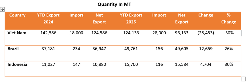 Vietnam, historically the dominant exporter, recorded a notable decline of 18,453 MT (-13%) in its year-to-date (YTD) exports. This reduction, however, was offset by increases from Brazil and Indonesia, which expanded their shipments by 12,581 MT (+34%) and 4,673 MT (+42%), respectively.