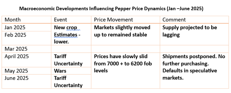 The global pepper market during the first half of 2025 was significantly influenced by a convergence of macroeconomic developments, policy uncertainty, and evolving trade dynamics. These factors collectively shaped price behavior, export volumes, and import responses across regions.