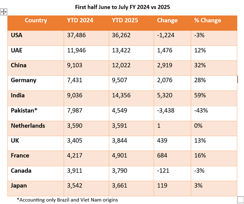 In contrast, Pakistan recorded significant declines 43%. These reductions may be linked to internal adjustments such as carryover inventories, changing dynamics in re-export strategies, or broader macroeconomic pressures affecting trade capacity.