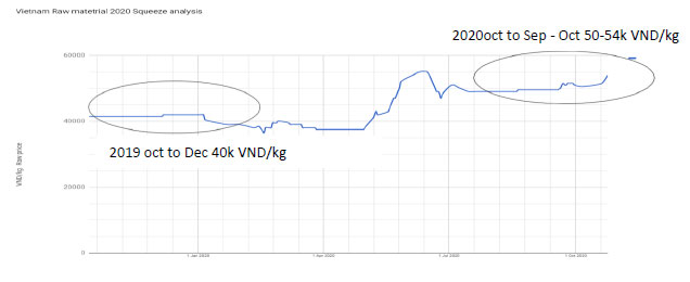 YTD 2020 despite being affected by Covid-19 was a good year in terms of Exports. The shipments from Vietnam from Jan to Sep or the first 9 months were down by 8%. The biggest fall in exports came from imports drop from China at 8,000 MT out of the total drop of 19,536 MT. The crop in Vietnam was short by 10% i.e. 25,000 MT and considering that many countries bought a little but more towards the end of 2019 for shipment in 2020, their offtake in 2020 was therefore marginally lower. Overall, the shipments and crop availability from Vietnam have been balanced. This kept prices stable till the first half of the year. As soon as China came back to market, the prices rose as supply was just in balance to demand and therefore any sudden spike in buying led to increase in price followed by a steady drop to stabilized at 50,000 VND/Kg of raw material.
