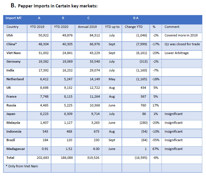 Covid-19 led shutdowns have impacted processors in India who were importing pepper and re-exporting the same to various locations. This has led to a drop in exports from India.