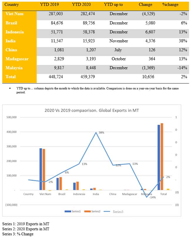 - Malaysia exported close to 1000 MT less on the other hand all other origins exported more than what they did in the previous year. In all close to 10,000 MT was exported more in 2020 when compared to 2019.