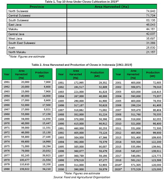 In 2019, the top 10 largest area of cloves cultivation were estimated to be North Sulawesi Province with 74,940 Ha, Central Sulawesi Province with 71,704 Ha, South Sulawesi Province with 63,136 Ha, East Java Province with 46,043 Ha, Maluku Province with 44,161 Ha, Central Java Province with 42,037 Ha, West Java Province with 35,697 Ha, South East Sulawesi with 31,388 Ha, Aceh Province with 25,530 Ha and North Maluku Province with 21,157 Ha (Table 1).