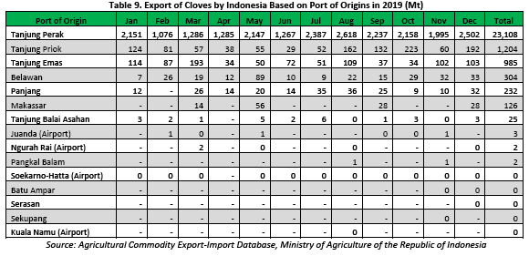 Cloves export by Indonesia was reported to be shipped through ports and airports all over the Indonesia such as Java, Sumatera, Sulawesi and Bali (Table 9). Based on the port of origin, the top five origins for cloves export by Indonesia in 2019 were reported to be Port of Tanjung Perak, Surabaya with 23,108 Mt (contributed to 89% of the total export from Indonesia), Port of Tanjung Priok, Jakarta with 1,204 Mt (5%), Port of Tanjung Emas, Semarang with 985 Mt (4%), Port of Belawan, Medan with 304 Mt (1%) and Port of Panjang, Lampung with 232 Mt (1%). Furthermore, cloves export from Indonesia was also reported to be flown through airport such as Juanda (Surabaya), Ngurah Rai (Bali), Soekarno-Hatta (Jakarta) and Kuala Namu (Medan) though its quantity was insignificant when compared to quantity of cloves export through the ports.