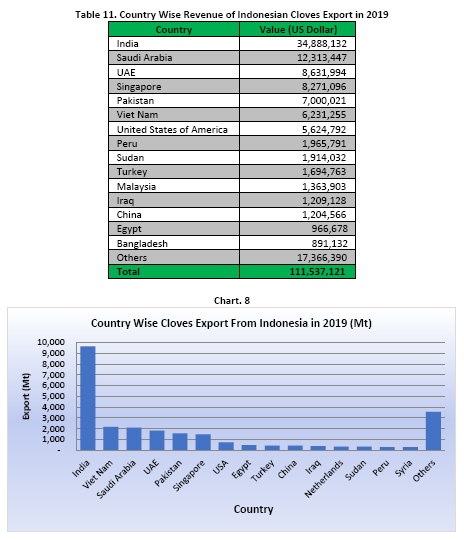 Cloves from Indonesia areglobally traded in Asia, America, Africa and European Countries (Table 10). In 2019, Indonesia's top 5 Country of destinations for its cloves were reported to be India with 9,638 Mt (an increase of 115% as compared with 2018), Viet Nam with 2,158 Mt (a decrease of 59%), Saudi Arabia with 2,100 Mt (an increase of 17%), United Arab Emirates with 1,820 Mt (an increase of 125%) and Pakistan with 1,559 Mt (an increase of 2%). In terms of value, Indonesia's top 5 contributors for its cloves export revenue were reported to be India with USD 34.8 Million, Saudi Arabia with 12.3 Million,United Arab Emirates with 8.6 Million, Singapore with USD 8.2 Million and Pakistan with 7.0 Million (Table 11).