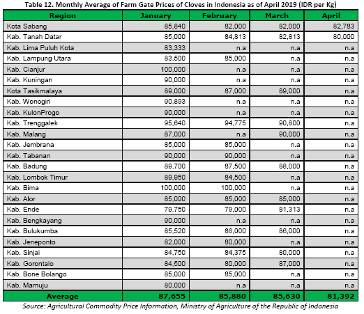 Farm gate price of cloves in Indonesia in the first quarter of 2019 fluctuated with a rather negatively outlook (Table 12). During that period, in several regency of cloves producer, clove farm gate price was reported to have recorded the highest price with IDR 100,000 per Kg (USD 7.0 per Kg) in January and February at Bima Regency and in January at Cianjur Regency, whilst the lowest price occurred in February at Ende Regency with only IDR 79,000 per Kg (USD 5.6 per Kg). Furthermore, the average farm gate price of cloves in most regions in Indonesia during January-April 2019 was recorded at IDR 85,139 per Kg (USD 6.02 per Kg).