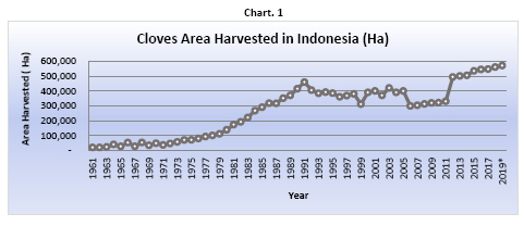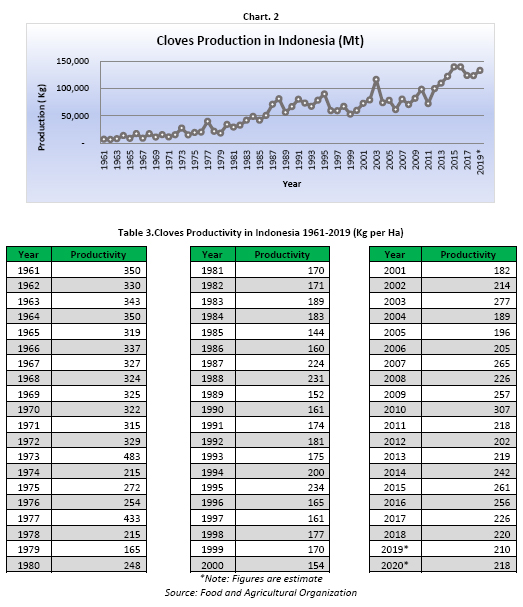 The area under cloves cultivation in Indonesia fluctuated with a rather increasing trend. During 1961-2018 Indonesia area of plantation was reported with significant increase of 541,212 Ha. The average increase of cloves area of plantation in the course of half century was recorded 9% per year with the highest increase recorded in 1968 with an increase of 96% as compared with the previous year. In 2018, the area under cloves cultivation in Indonesia recorded the largest ever in the history with a total of 561,212 Ha, recording an increase of 2% when compared to 2017. Furthermore, for the year 2019 and 2020, the area under cloves cultivation was estimated to increase by 2% and 0.4% respectively to 571,305 Ha in 2019 and 573,529 in 2020. The increase in the area of cloves plantation could be contributed to Indonesia government program of rehabilitation of dying farm and expansion of area under clove cultivation (Table 2).