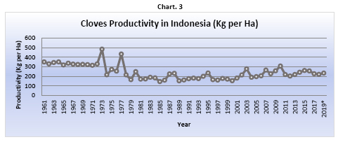 Cloves productivity in Indonesia during 1961-2018 was reported to be fluctuated with a rather stable trend. In the past 3 years cloves productivity in Indonesia saw decreasing trend to a total of 220 Kg per Ha in 2018. Since 1961 to 2018, cloves productivity in Indonesia was reported with a decrease by 37%. The average increase of cloves productivity in Indonesia was reported at 2% per year and the highest was reported in 1973 with 483 Kg per Ha whilst the lowest occurred in 1985 with only 144 Kg per Ha (Table 3). Furthermore, in 2019, Indonesia cloves productivity was estimated at 210 Kg per Ha or a decrease of 4% as compared to 2018. Whilst, in 2020 Indonesia cloves productivity was estimated at 218 Kg per Ha or an increase of 4% as compared to 2019. Despite Indonesian Government efforts in recent years developing a superior seed of clove which could be used by planters to replanting old or damaged plants andalso to boost the productivity of cloves plantations as well as the Directorate General of Plantations of Indonesia application of good agricultural practices (GAP) to clove plantation in various clove producing area, Indonesia's clove productivity was yet to show an increase trend following a decreasing streak which started in 2016.