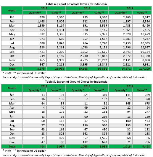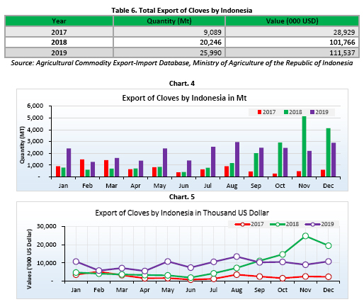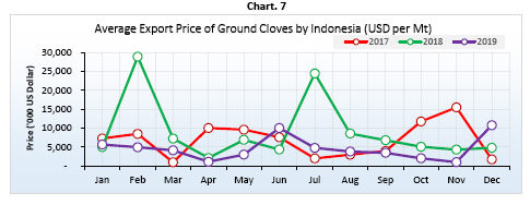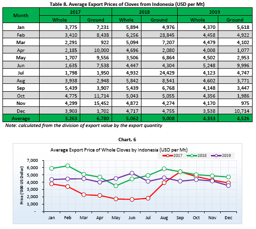 Contrary with 2018, the average export prices of cloves by Indonesia in 2019 saw a decreasing trend. The average export prices of whole cloves by Indonesia was reported at USD 4,333 per Mt for whole cloves and USD 4,526 per Mt for ground cloves.Thus, recording a decrease by 14% and 50% respectively when compared to 2018. The highest average export price of cloves by Indonesia in 2019 was recorded in June with USD 5,248 per Mt for whole cloves and in December with USD 10,714 per Mt for ground cloves. Whilst, the lowest average export price of cloves was recorded in December with USD 3,538 per Mt for whole cloves and in November with only USD 975 per Mt for ground cloves.