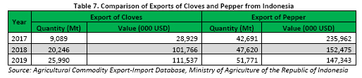 Furthermore, in the past three years export of cloves and pepper by Indonesia had been reported with an increase. Although Indonesia is the world largest cloves producer in the world, export quantity and value of cloves from Indonesia was reported to be inferior to pepper export. The total quantity of cloves export in the past three years was reported at 55,326 Mt whilst the total quantity of pepper export was reported with 142,082 Mt. Thus, recording the annual ratio quantity of Indonesia export between cloves and pepper during 2017-2019 at 1:5, 1:2 and 1:2 respectively. The total value of cloves export in the past three years was reported as high as USD 242.2 Million whilst the total value of pepper export was reported as high as USD 535.7 Million. Thus, recording the annual ratio value of Indonesia export between cloves and pepper during 2017-2019 at 1:8, 1:1 and 1:1 per year respectively (Table 8).