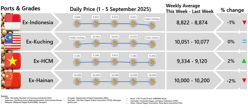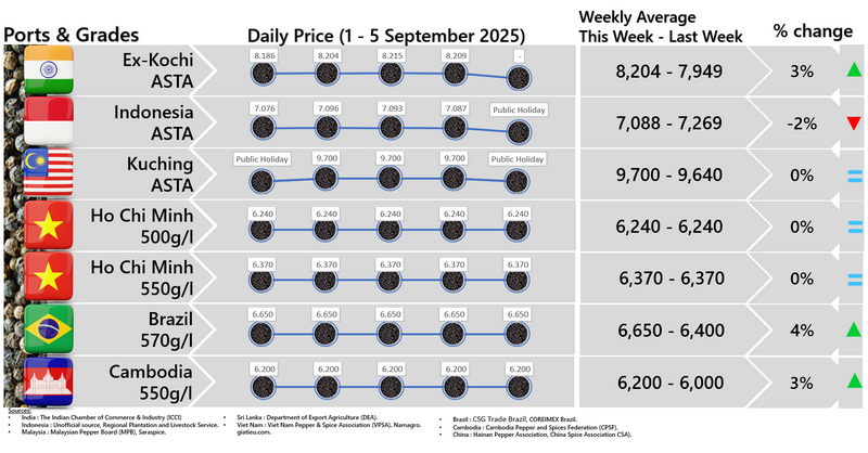 - Producers prices ex Lampung and Pangkal Pinang are average prices received by farmers for unprocessed pepper