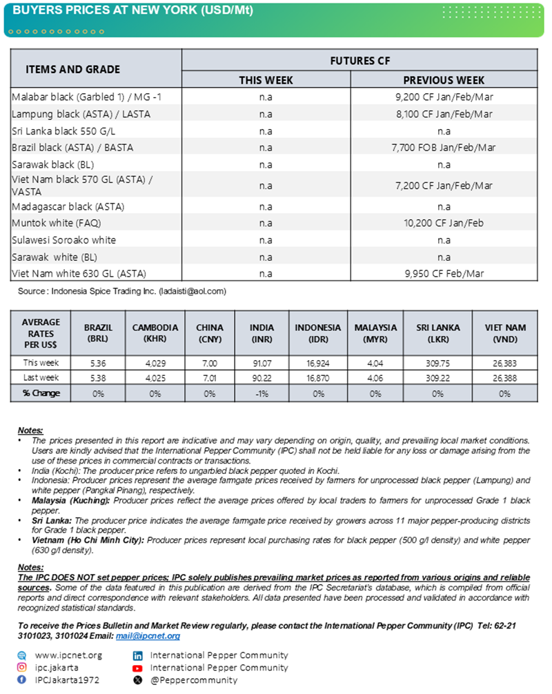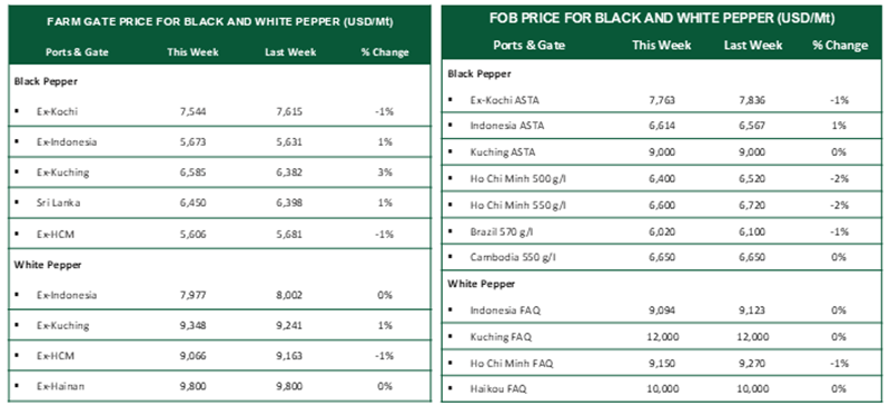 | In Indonesia, black pepper prices posted a modest upward adjustment, while white pepper prices remained stable throughout the week. Price stability was supported by relatively steady exchange rate conditions. | |