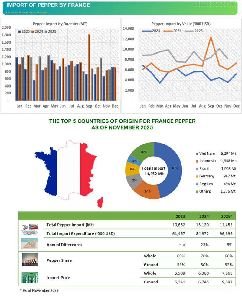 | From a trade standpoint, France's cumulative pepper imports amounted to 11,452 metric tonnes during the January–November 2025 period. Viet Nam maintained its position as the leading supplier with 5,294 metric tonnes, followed by Indonesia, Brazil, Germany, and Belgium as notable secondary sources. | |