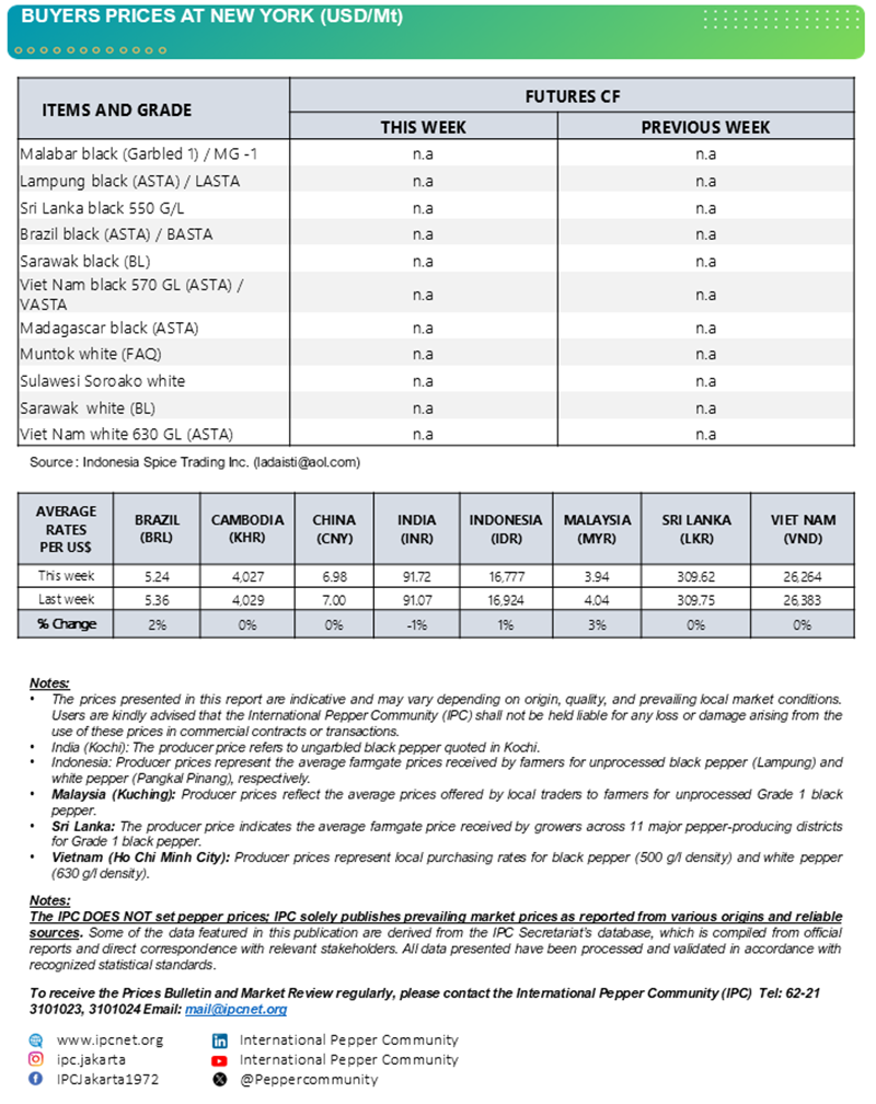 | India saw a continued softening of pepper prices in both domestic and international markets, marking a second consecutive week of decline. The adjustment coincided with a depreciation of around 1 percent in the Indian Rupee, which averaged INR 91.72 per USD over the reporting period. | |