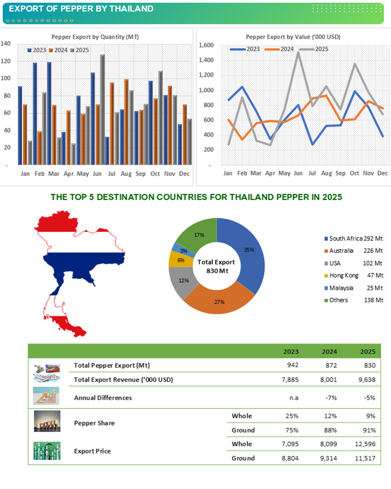 | During the period 2025, Thailand exported a total of 830 metric tonnes of pepper. South Africa emerged as the principal destination, accounting for 292 metric tonnes, followed by Australia, the United States, Hong Kong, and Malaysia. | |