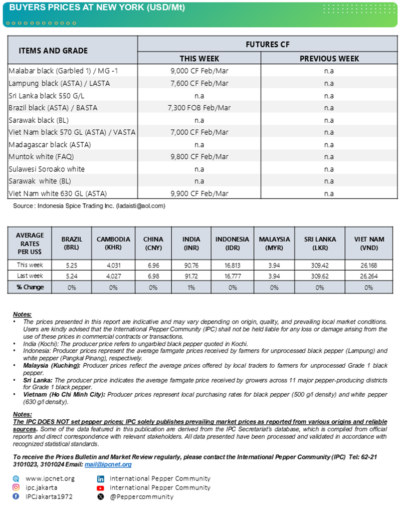 | Similarly, prices of Brazilian black pepper, Cambodian black pepper, and Chinese white pepper remained stable and unchanged during the reporting week, indicating relatively calm trading conditions in these origins. | |