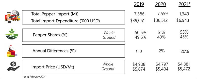| 03 | Malaysia - Prices for black and pepper have increased significantly in May 2021 compared to same period last year. |