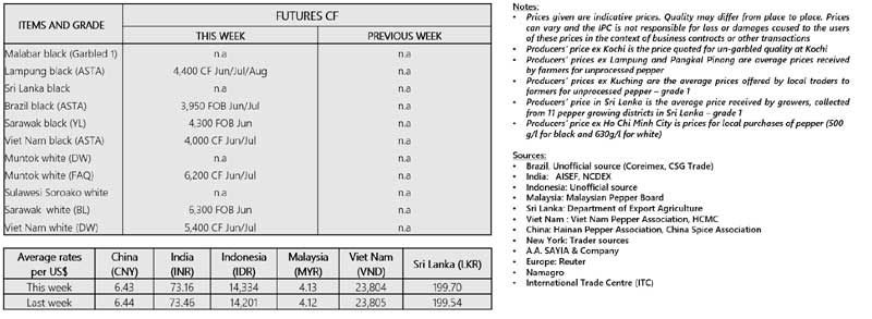 | 04 | USA - Market was reported with limited trading activities. Muntok white pepper CF June/July at USD 6,200 per Mt. |
