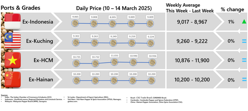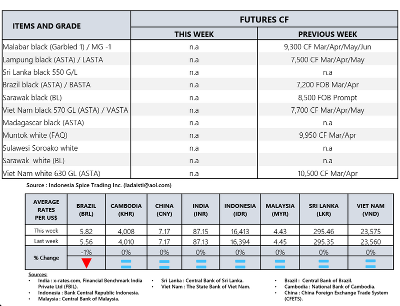 - Producers\' prices ex Lampung and Pangkal Pinang are average prices received by farmers for unprocessed pepper