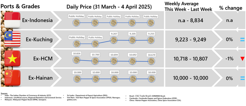 - Producers\' price ex Ho Chi Minh City is prices for local purchases of pepper (500 g/l for black and 630g/l for white)