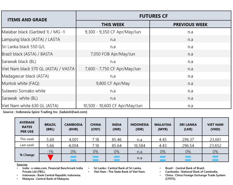 - Producers\' prices ex Lampung and Pangkal Pinang are average prices received by farmers for unprocessed pepper