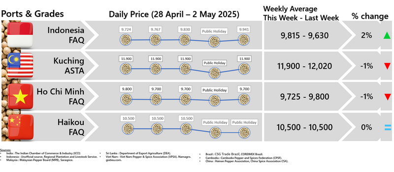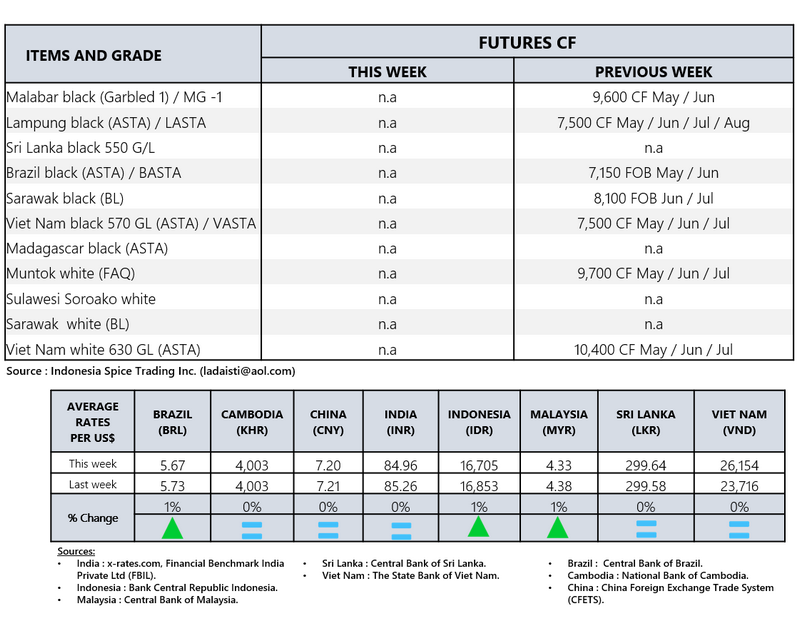 - Producers\' prices ex Lampung and Pangkal Pinang are average prices received by farmers for unprocessed pepper