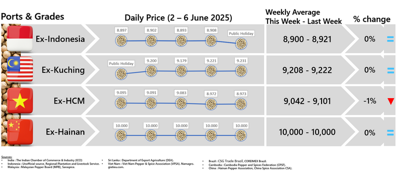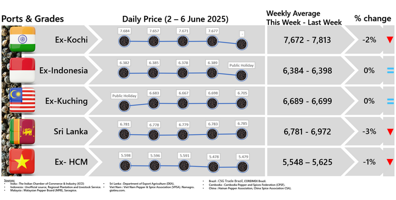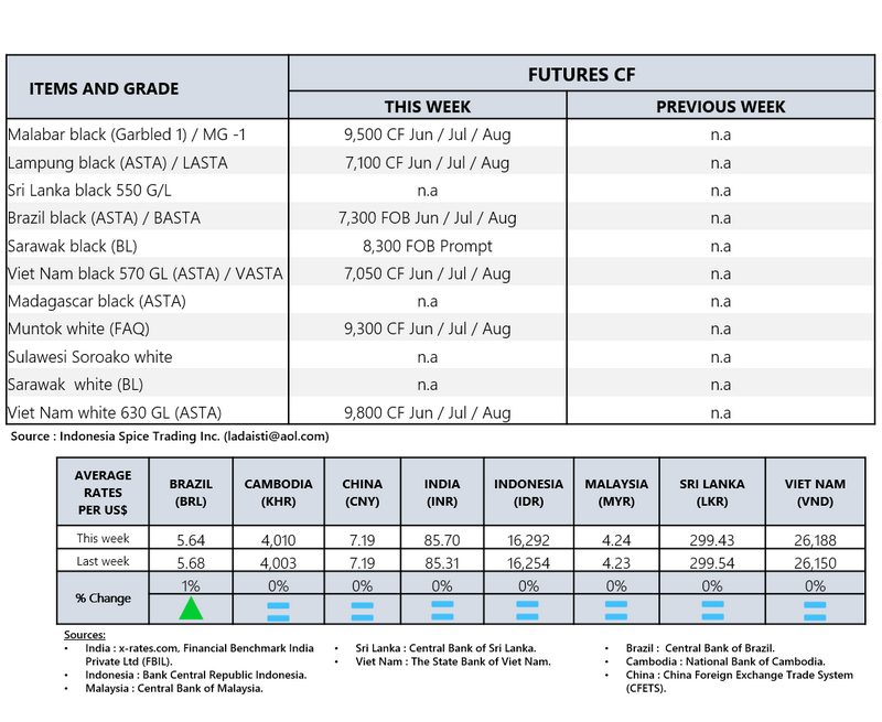 - Producers\' prices ex Lampung and Pangkal Pinang are average prices received by farmers for unprocessed pepper