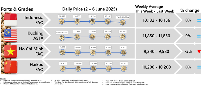 - Producers\' price ex Ho Chi Minh City is prices for local purchases of pepper (500 g/l for black and 630g/l for white)
