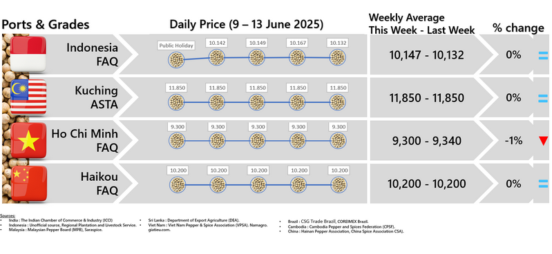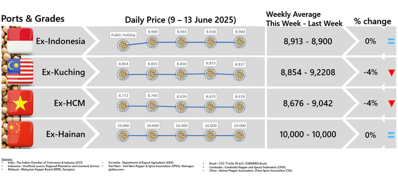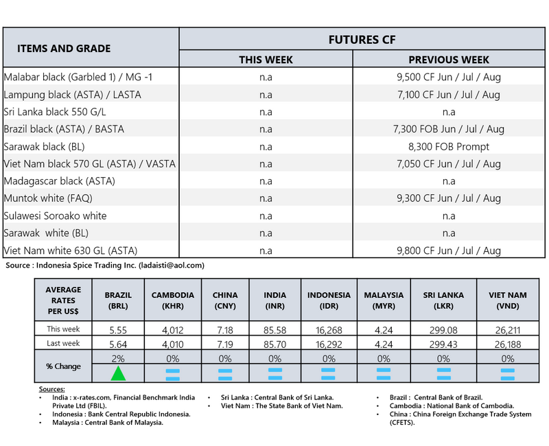 - Producers\' prices ex Lampung and Pangkal Pinang are average prices received by farmers for unprocessed pepper