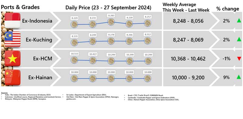 - Producers\' prices ex Lampung and Pangkal Pinang are average prices received by farmers for unprocessed pepper