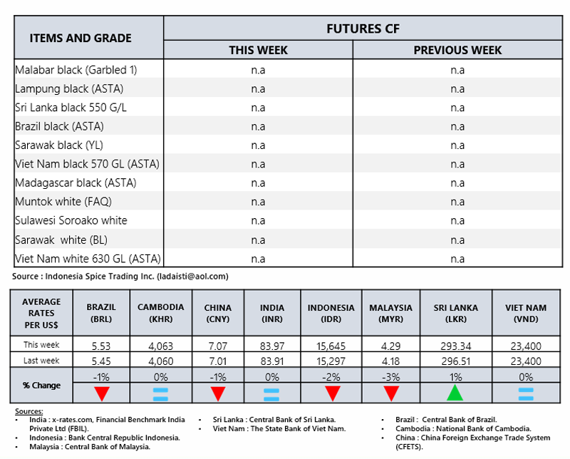 - Producers\' prices ex Lampung and Pangkal Pinang are average prices received by farmers for unprocessed pepper