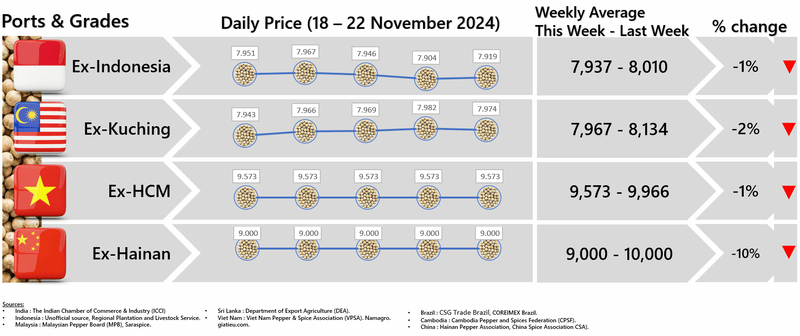 - Producers\' prices ex Kuching are the average prices offered by local traders to farmers for unprocessed pepper - grade 1
