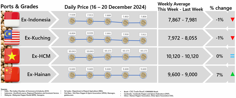 - Producers\' prices ex Kuching are the average prices offered by local traders to farmers for unprocessed pepper - grade 1