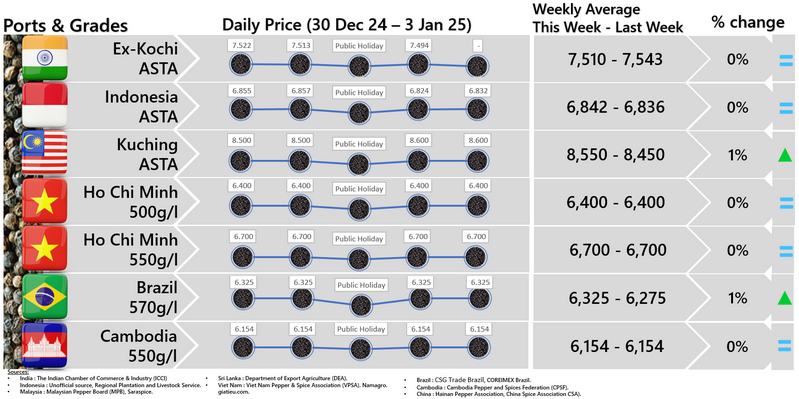- Producers\' prices ex Kuching are the average prices offered by local traders to farmers for unprocessed pepper - grade 1