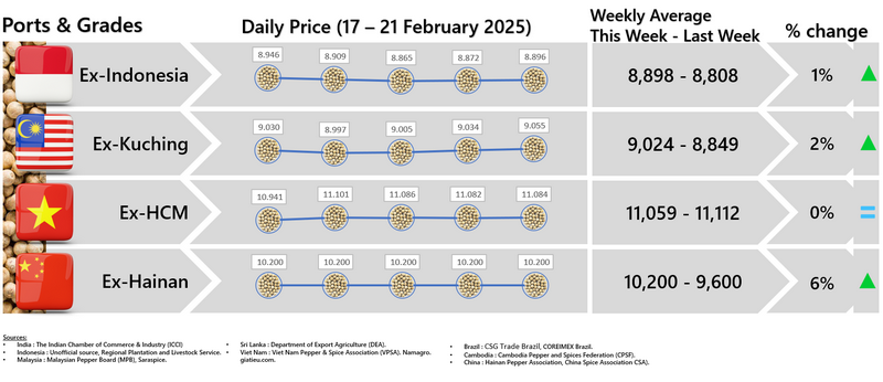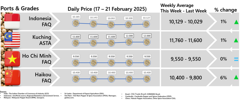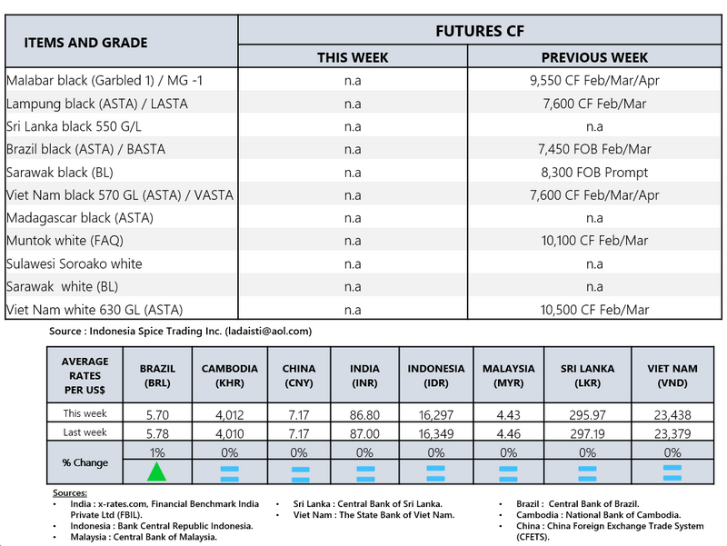 - Producers\' prices ex Lampung and Pangkal Pinang are average prices received by farmers for unprocessed pepper
