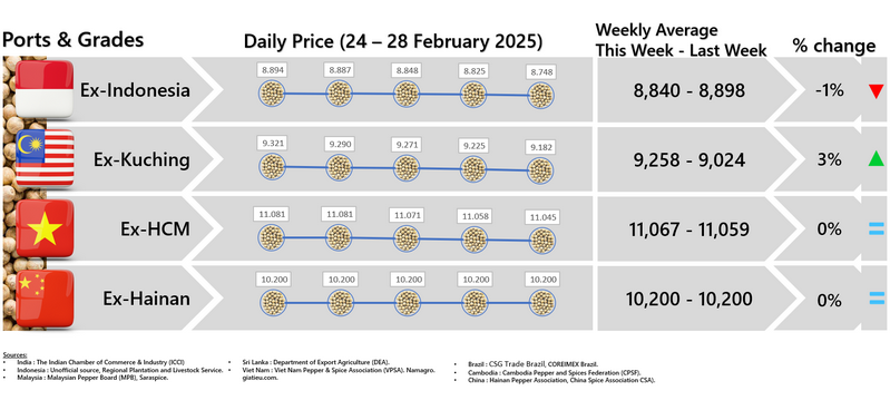 - Producers\' prices ex Kuching are the average prices offered by local traders to farmers for unprocessed pepper - grade 1