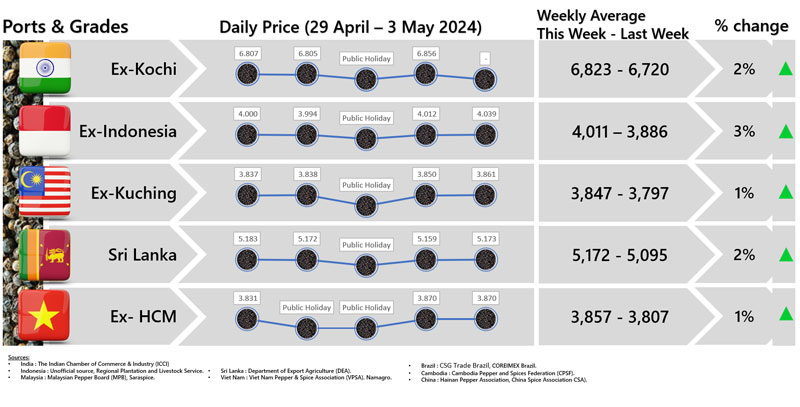 - Producers\' price ex Ho Chi Minh City is prices for local purchases of pepper (500 g/l for black and 630g/l for white)