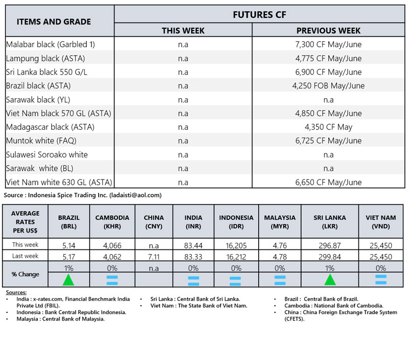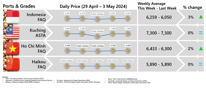 - Producers\' prices ex Lampung and Pangkal Pinang are average prices received by farmers for unprocessed pepper