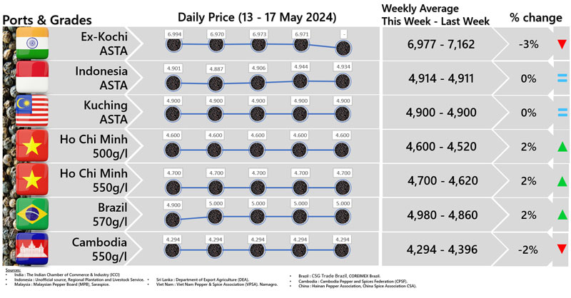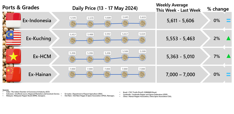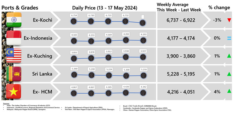 - Producers\' price ex Ho Chi Minh City is prices for local purchases of pepper (500 g/l for black and 630g/l for white)