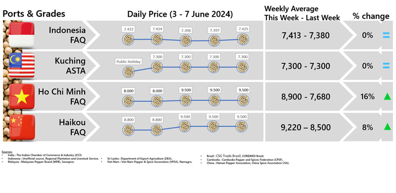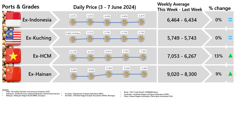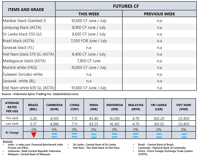- Producers\' prices ex Lampung and Pangkal Pinang are average prices received by farmers for unprocessed pepper