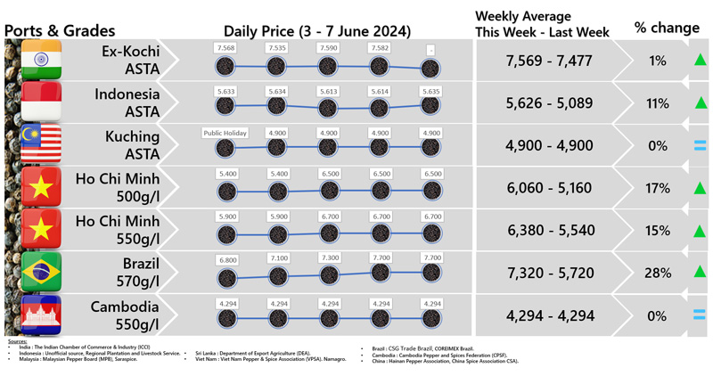 - Producers\' price ex Ho Chi Minh City is prices for local purchases of pepper (500 g/l for black and 630g/l for white)