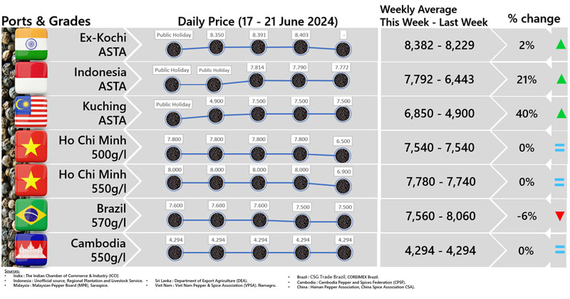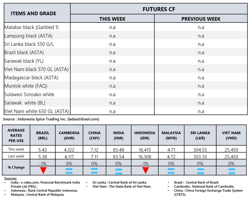 - Producers' prices ex Lampung and Pangkal Pinang are average prices received by farmers for unprocessed pepper